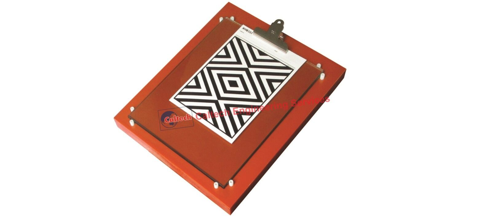 It consists of a glass clip board set firmly on a phenolic plastic panel. The entire apparatus is mounted on rubber supports is order to eliminate sliding while in use. The drawdown surface is 6.4mm thick polished glass, equal in planarity to fine mirror glass. A steel clip holds the chart firmly while the drawdown is made. The workable area is equal to the size of the glass plate.